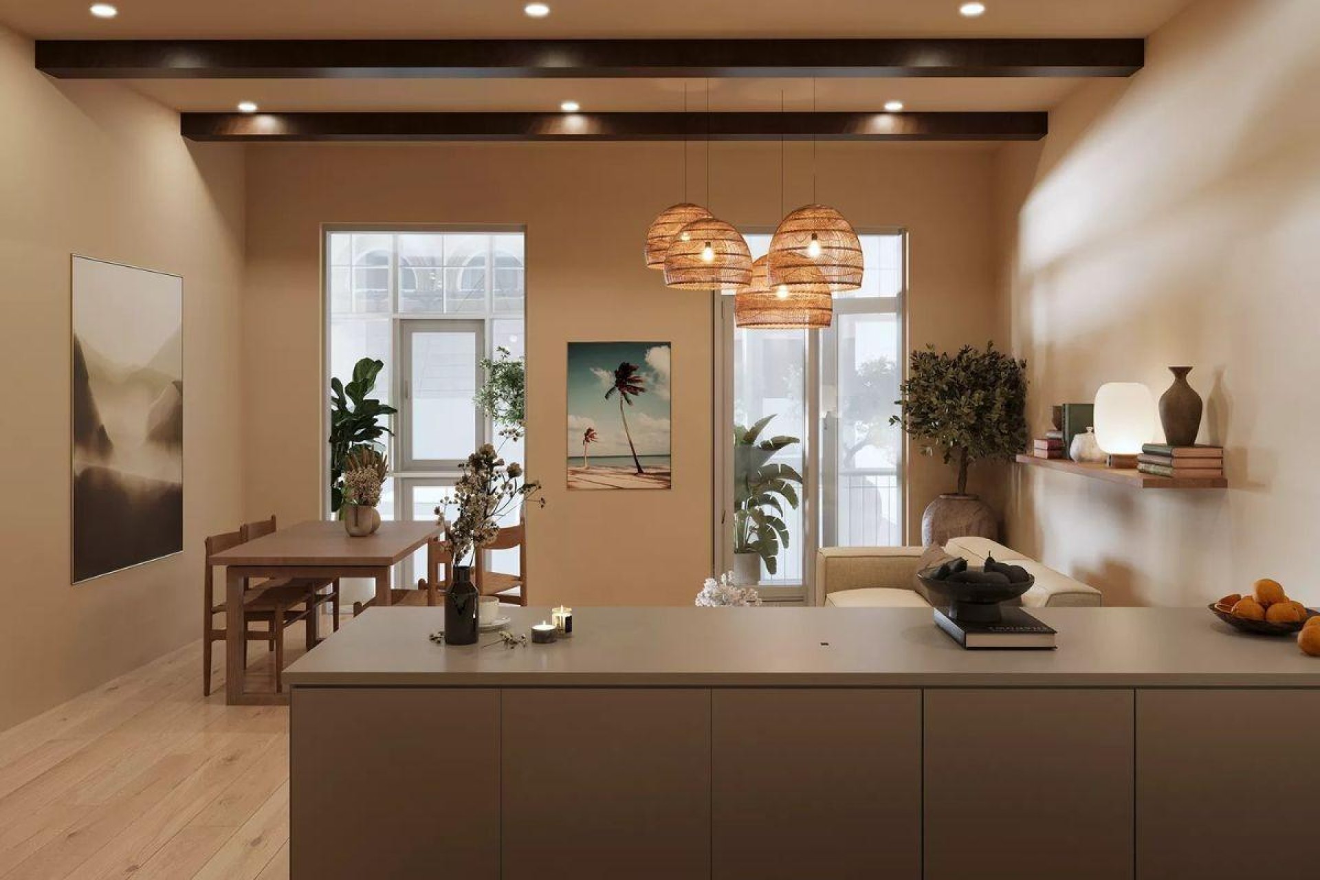 Situated two level above the street, this apartment ensures privacy and includes a charming private courtyard. Upon entering from the staircase, you’ll find practical clothes storage, leading through the corridor to both the private bedrooms and the inviting living room seamlessly connected to the modern and subtly designed kitchen. The living room features a small balcony and a splendid bay window overlooking the street. The smaller bedroom accommodates a bed, clothes storage, and space for a small desk. The guest bathroom boasts its own shower and shares the same exclusive material composition as the master bathroom. The interior and exterior visualizations may differ slightly from the final design of the apartments and building.